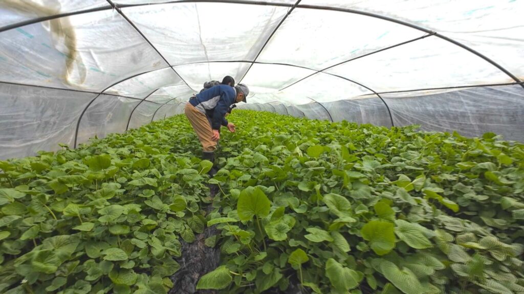 坂井さんは山林でワサビを育てたあと、ビニールハウスに移して出荷まで大切に育てています。