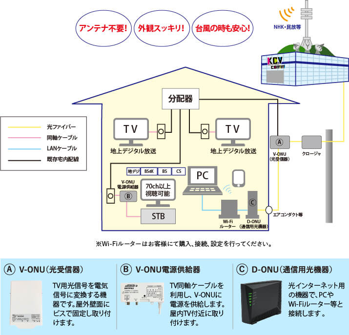 クロージャから電柱を経由し、光ファイバーケーブルを引き込み、家屋の外壁にV-ONUを取り付け、既存のテレビ配線に接続します。