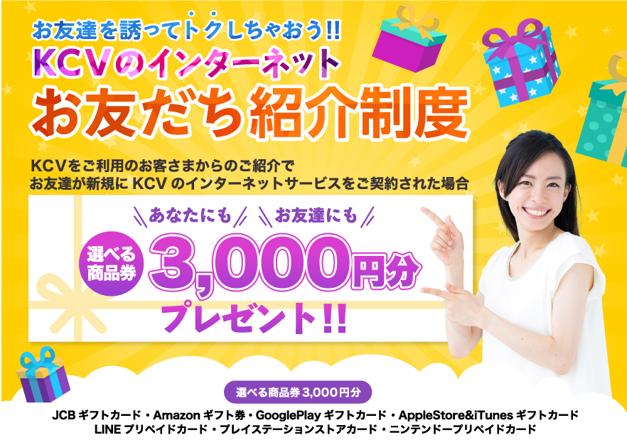 ※ご紹介頂く方はKCVに加入可能な地域にお住まいの方が対象となります。ただしサービスエリア提供内でも、建物や道路事情、ケーブル設備の都合により、サービスを提供できない場合があります。
