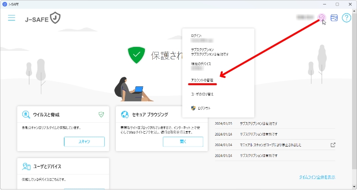 J-SAFE上のユーザーアイコンをクリックし、[アカウントの管理]を選択することで、My J-SAFEポータルにアクセスすることができます。