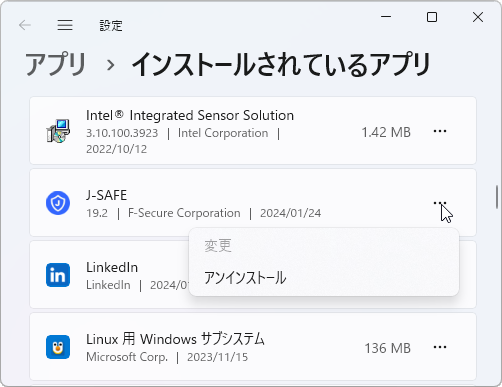 画面左下の[スタート]の上で右クリックし、表示されるメニューから[インストールされているアプリ]を選択します。[…]をクリックし、アンインストールを選択します。